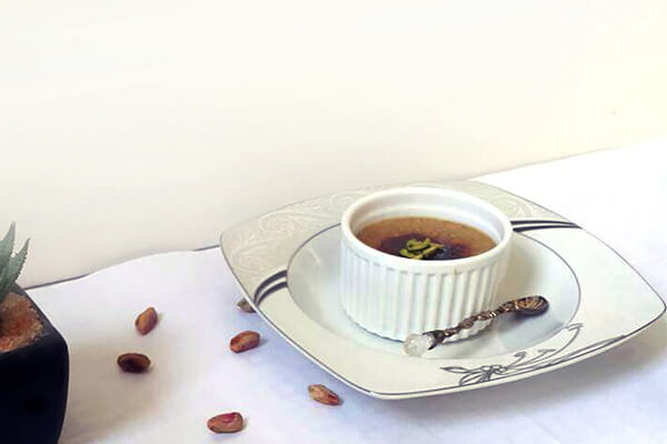 در قابلمهای مناسب خامه، شیر، عسل، نمک و کرم پسته را بریزید و روی حرارت ملایم قرار دهید تا گرم شود. زردهها و وانیل را با همزن دستی بزنید تا مواد یکدست شود. خامه گرم را روی شیر ریخته و سریع میکس کنید. مواد را درون فر ۱۷۵ درجه از پیش گرم شده حدود ۲۵ دقیقه بپزید. اجازه دهید به همان صورت خنک شود سپس درون یخچال حدود ۴ ساعت قرار دهید تا خودش را بگیرد. روی هرکدام مقداری شکر بریزید و با کمک دستگاه تورچ شکر را کاراملی کنید. با .مقداری پسته تزئین و سرو کنید